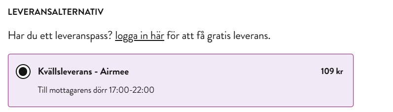 När du är inloggad kan du bläddra bland urvalet och välja den vara du vill beställa. När du har valt den produkt du vill ha behöver du sätta ett önskat leveransdatum. Ange sedan leveranspostnumret i rätt fält. När du anger postnumret visas en rullgardinsmeny med möjliga leveransadresser; Välj rätt adress från denna lista. Efter att ha slutfört dessa steg erbjuds du två leveransalternativ. Det är viktigt att notera att, som visas i exemplet nedan, indikerar detta att du för närvarande inte är inloggad på ditt konto. Inloggning krävs för att dra nytta av alla tillgängliga leveransalternativ och förmåner.